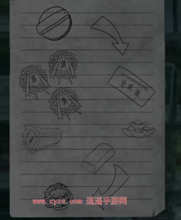 9. 左转,先查看神社。从左下角放香的纸板箱中取出纸棺材和剪刀。出去挖右边的垃圾桶,找到死老鼠。回到便利店,把死老鼠和棺材放在上面。接过财神手里的小木盘。