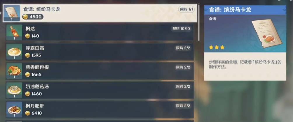 1.芳丹“德波德酒店”新增菜品“多彩马卡龙”,2250莫拉即可购买菜谱。