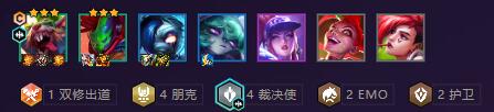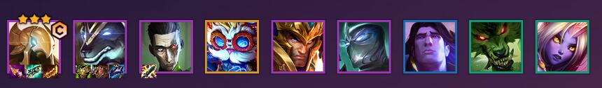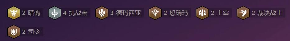 羁绊:2 暗裔+ 4 挑战者+ 3 德玛西亚+ 2 恕瑞玛+ 2 霸主+ 2 审判战士+ 2 指挥官