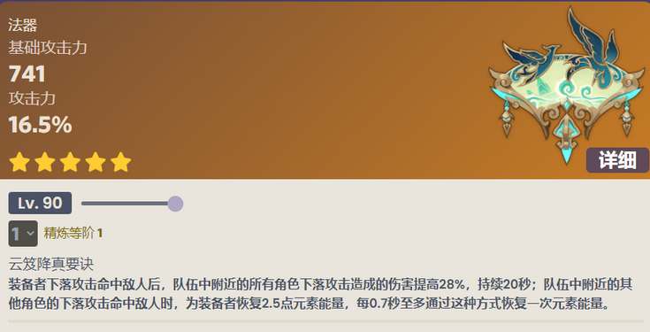 2.武器特效:坠落攻击击中目标时,队伍中角色的坠落攻击伤害会增加。当其他角色用坠落攻击击中敌人时,佩戴者的元素能量可以恢复。