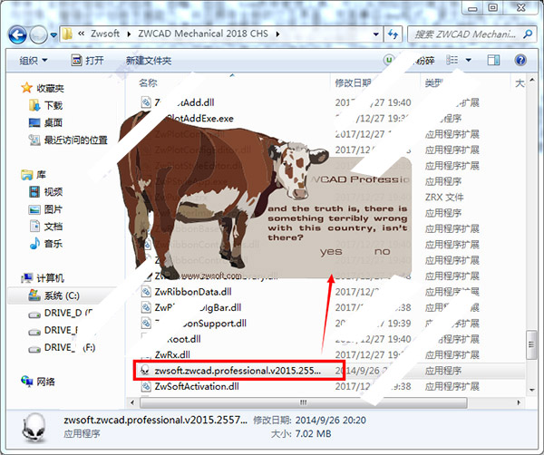 5、随后我们鼠标双击破解补丁“zwsoft.zwcad.professional.v2015.25578-ismail.exe”运行,点击“yes”对原程序打入破解补丁(需要注意的是:破解补丁使用一次不一定成功,可以多试几次,直至破解完成)