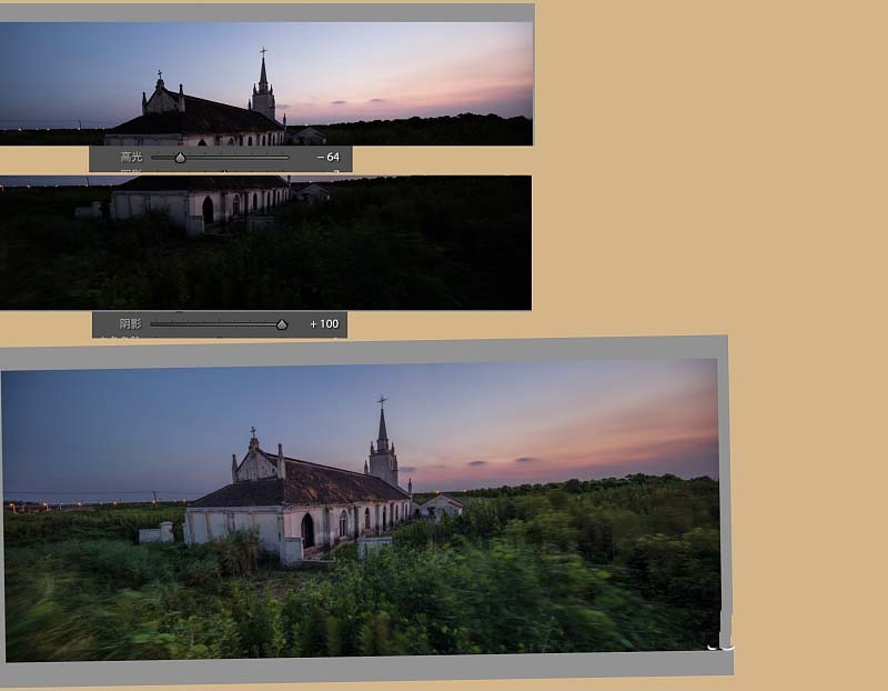 图片接好后发现天空亮部没有细节,所以调整高光选项,同理暗部也做了调整,因为是RAW格式的所以可以直接拉到头。