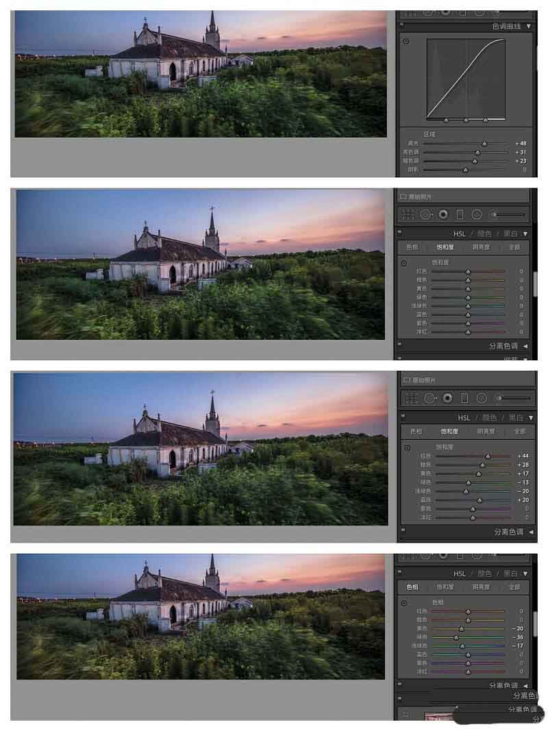 颜色部分由于是黄昏所以在色相里面把绿色往左偏,显的绿植稍微黄一点点,更加凸显气氛。