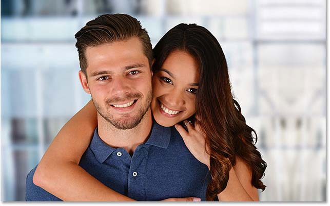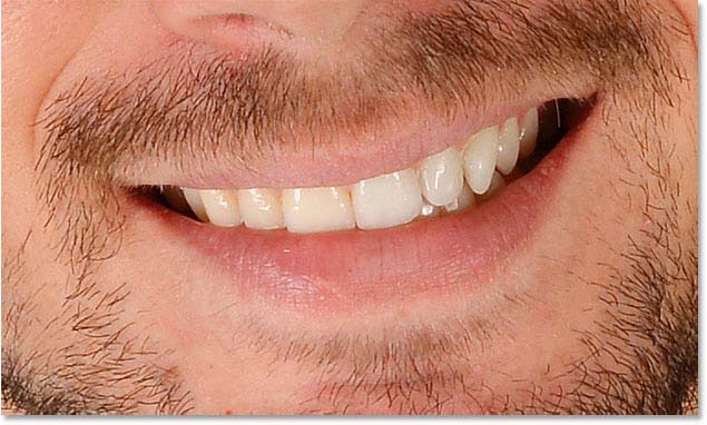 为了更好地判断结果,您可以通过单击“图层”面板中的调整图层的眼球图标来比较去饱和版本与原始版本的牙齿。点击一次以暂时隐藏调整图层的效果并查看原始图像,再次单击以重新打开调整图层,并查看编辑的版本: