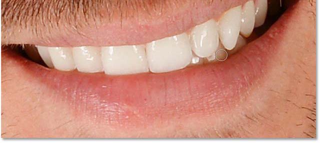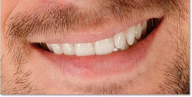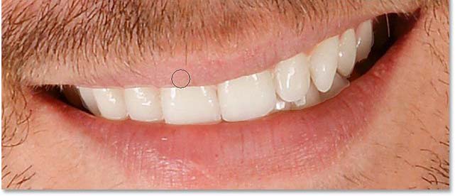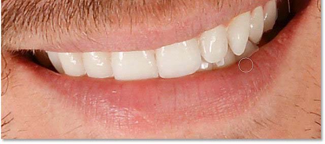根据您的套索选择的准确程度,您可能会注意到牙齿周围的区域也会有变化,放大可以看得更清楚。沿着牙齿顶部和底部的嘴唇、牙龈有一些不必要的变亮。接下来我们将清理这些区域: