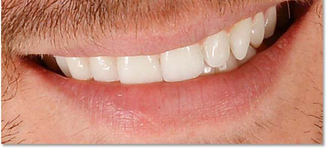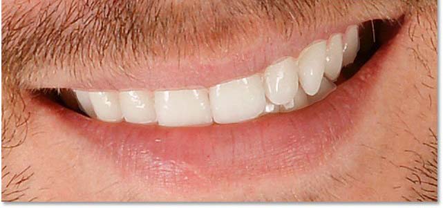 这是一个前后比较,显示了色相/饱和度调整层到目前为止的差异。牙齿的左半部分是牙齿原来的样子,右半部分是亮白后的效果: