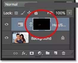 Photoshop中调整图层的一个很好的特性,就是它们带有内置的图层蒙版。如果我们在“图层”面板中查看“色相/饱和度”调整图层,我们可以看到图层蒙版的缩略图。缩略图主要用黑色填充,只有一小部分填充白色,黑色代表我们图像中不受色相/饱和度调整层影响的区域;白色的是该地区正在受到影响。