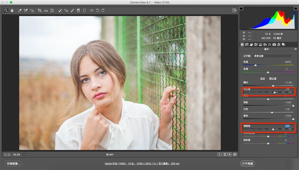 6、提升曝光后我们发现整体皮肤是比较透亮了,但是整个片子还有点灰,所以我们还需要再将对比度与清晰度调整好: