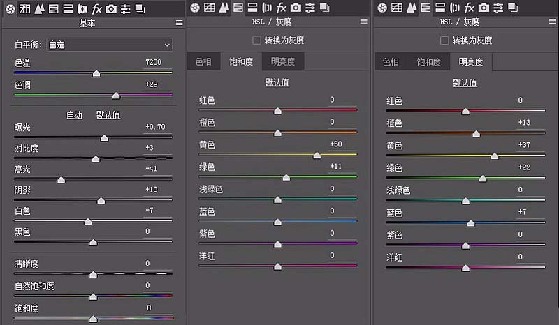 首先进入ACR做如下调整,稍微提高色温数值,使画面偏暖。追回部分细节,加强颜色的饱和度,提高黄色明度使画面中茶和树木更突出。