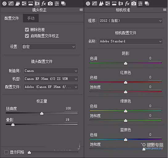 再进行校正镜头,可适当保留暗角。提高蓝原色饱和度(相比直接提高饱和度而言,整体更自然,但会对蓝色影响更多)