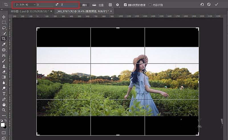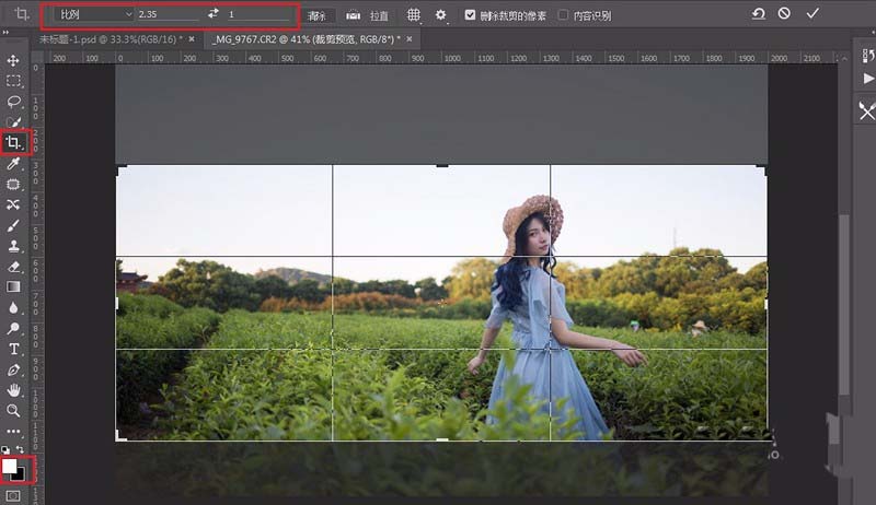 剪裁电影画幅。如图,先选择剪裁工具,设置为“比例”模式,将数值改为“2.35:1”,进行二次构图剪裁并点击确定。之后将背景色设置为黑色,比例设置为“3:2”,向外剪裁出黑色边框。