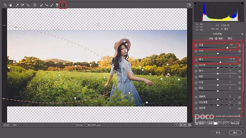 进行剪裁后我们再第二次进入ACR进行局部调色,将主要使用“径向滤镜”和“渐变滤镜”做局部处理。点击“滤镜-Camera Raw”进入,选择径向滤镜工具,在图中所示的位置进行加曝光、加色温的处理。可以看到在图中有大量径向滤镜范围的控制点,主要施加在受光面,符合明暗关系,同时突出侧逆光。