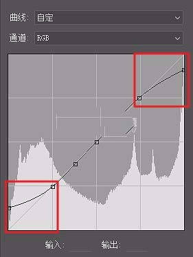 然后进入曲线调整成如下形态。注意左下角和右上角,提亮黑场和压暗白场,这样照片中就没有死黑和纯白,显得更“灰”,提高了视觉上的宽容度,仿佛有更多的细节(实际已丢失)。