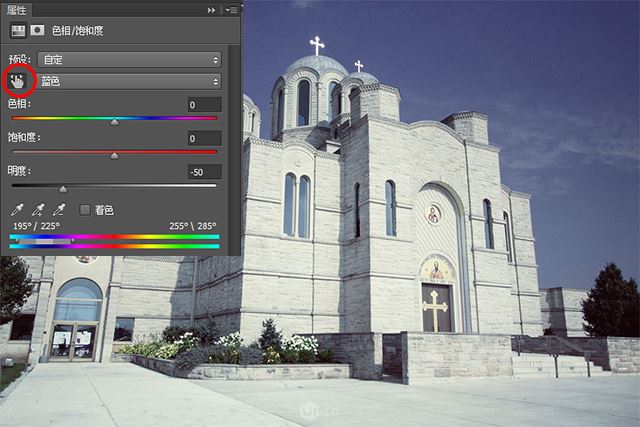 一、添加一个“色相/饱和度”调整图层。单击带有左右箭头的小手图标,然后在图像中的蓝色天空区域单击。将明度调整到-50,使天空变暗。