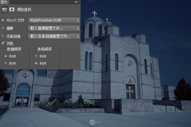 在“3DLUT 文件”的下拉菜单中,选择“NightFromDay.CUBE”。这个颜色查找表可以将白天转换为黑夜。在图层面板设置“颜色查找”调整层的不透明度为70%。