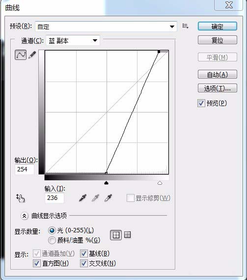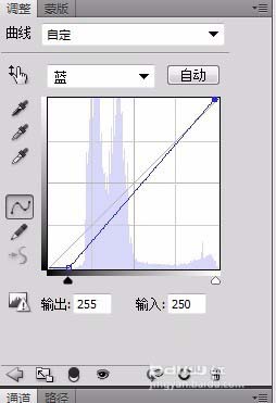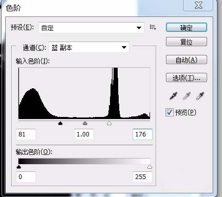 5、复制背景层,并置顶;进入通道面板,选择蓝色通道,并复制,执行色阶、曲线命令,调整参数增加明暗对比