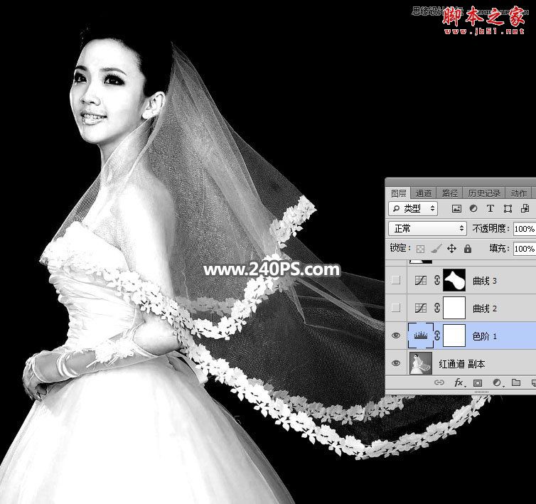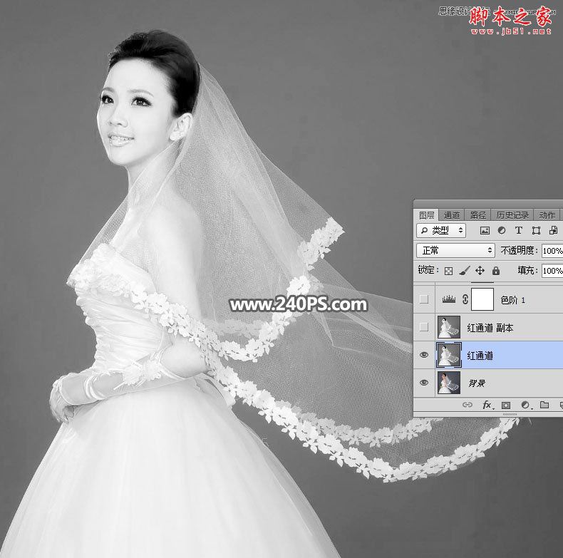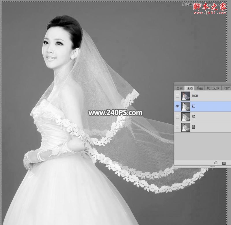 选择红通道:婚纱颜色与背景色差比较大,比较理想。