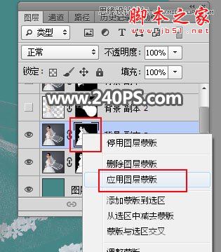 22、在当前图层蒙版缩略图上鼠标右键,选择“应用图层蒙版”。