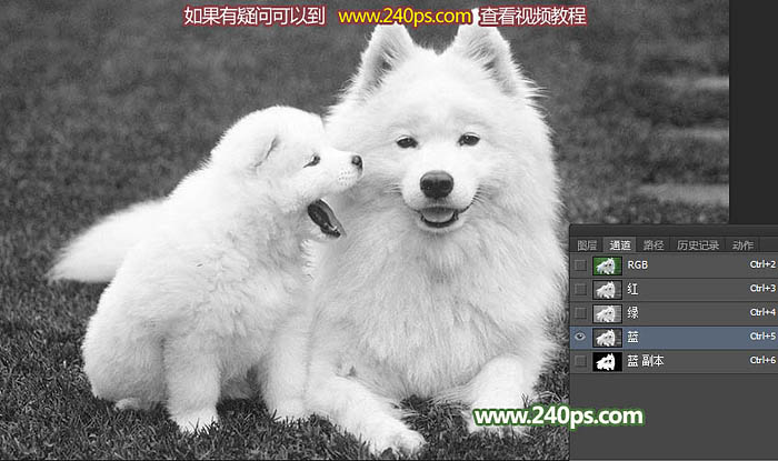 2、进入通道面板,观察一下各通道,蓝色通道小狗与背景色差比较大,非常适合。把蓝色通道复制一层,得到蓝副本通道。