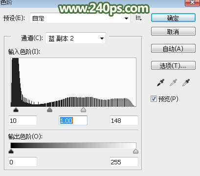 4、按Ctrl + L 调整色阶,把高光调亮,暗部压暗,参数及效果如下图。