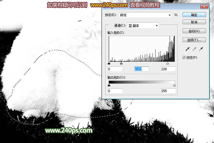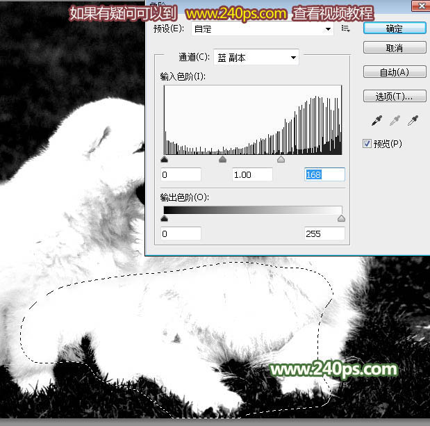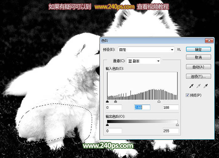 7、用套索工具把大狗底部偏暗的区域选取出来,羽化10个像素后按Ctrl + L 调整色阶,调亮一点,参数及效果如下图。