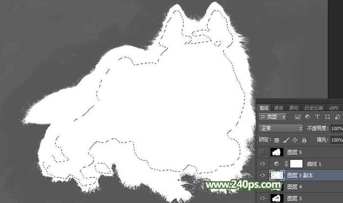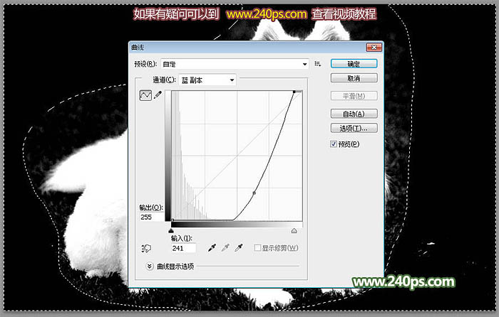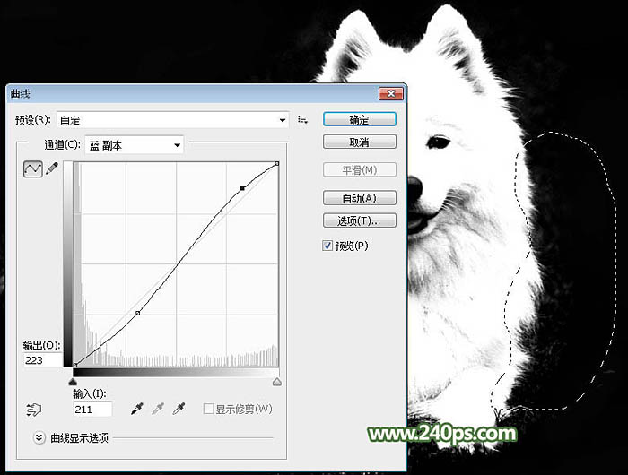 10、用套索工具把大狗右侧边缘的毛发选取出来,羽化5个像素后按Ctrl + M 调整曲线,增加明暗对比,参数及效果如下图。