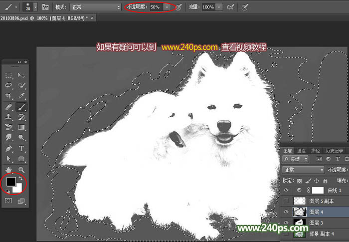 32、选择画笔工具,把前景色设置为白色,画笔不透明度设置为20%,然后用画笔把小狗毛发边缘涂成白色。