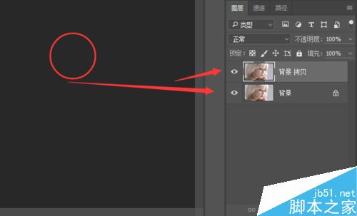 3.点击美女背景图层拖拽至下方图中所指图标,复制新创建拷贝美女背景图层2