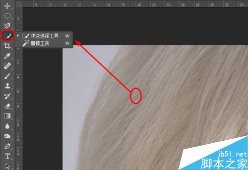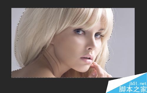 5.光标移动至美女背景图层编辑区,由人物里向人物四周头发边缘;用快速选择工具框选,大致选择一个人物抠图范围;