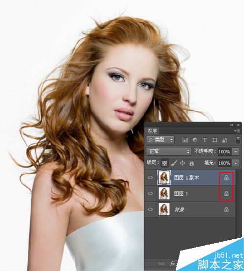 1、首先将准备好的美女照片在PS里打开照片,执行CTRL+J两次,复制图层得到图层1和图层1副本,分别锁定图层,如下图所示