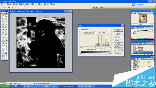 7、在右下角通道中点击选择刚刚被保存的通道,然后在主菜单中选择:图像——调整——色阶,在弹出窗口中的输入色阶中,调整左右端的黑色和白色调整三角形,使图像调整为纯黑及纯白色。点击确定。