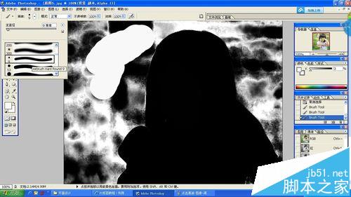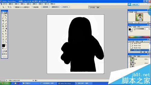 8、选择——取消选择,然后按键盘B键或者在左侧菜单中选择画笔工具(选择较硬度较大,无边缘的画笔),将画笔直径适当调大,并将前景色调整成白色,将不需要的背景部分全部涂白。然后置换前景色为黑色,将需要的部分尽量涂黑。