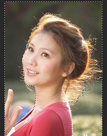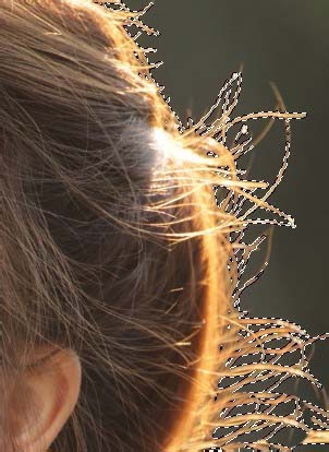 9、按下属性面板底下的确定按钮,可以看见选取范围变得细致,沿着发丝而走。