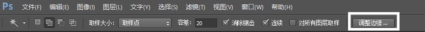 4、在选取工具使用的情况下,在上方工具栏可以找到”调整边缘“的按钮,点一下使用它。
