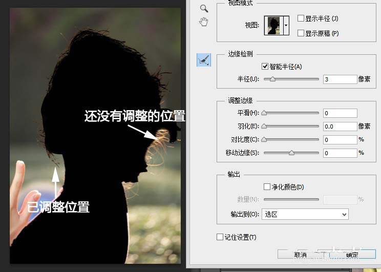 7、在图片中,可以看见彩色的部分是选取了的部分,而黑色则没有选取的部分。把发丝等没有给选取的部分给画一下,会发现,PS自动侦测了发丝,选取边缘给调整过来了。以同样的方法,把所有的边缘调过来。