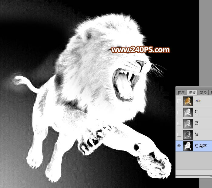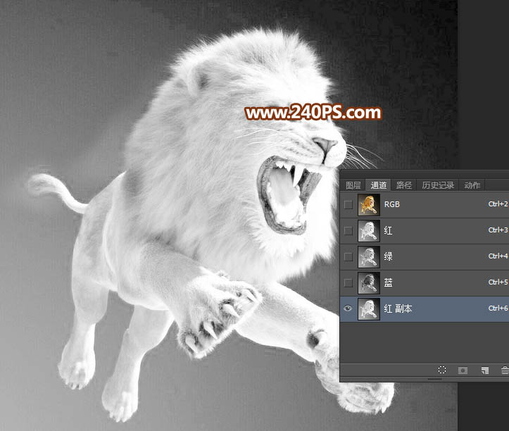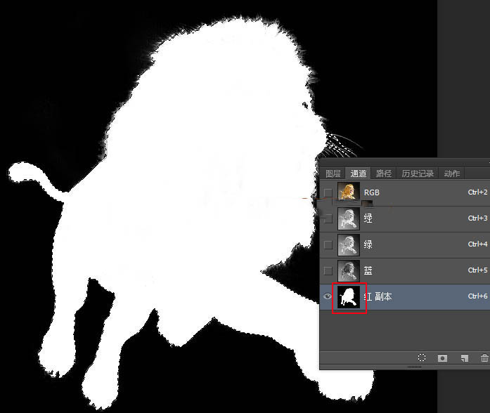 7、进入通道面板,观察各个通道,红通道毛发与背景色差较大,比较合适;把红通道复制一份,得到红副本通道,如下图。