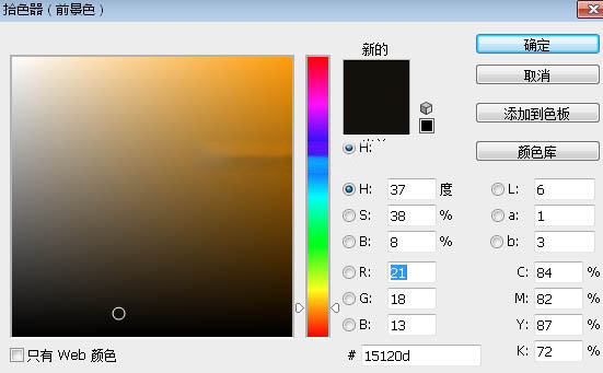 19、在当前图层下面新建一个图层,把前景色设置为暗褐色#15120d,然后用油漆桶工具填充前景色。