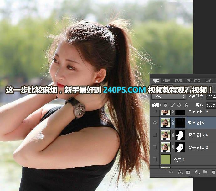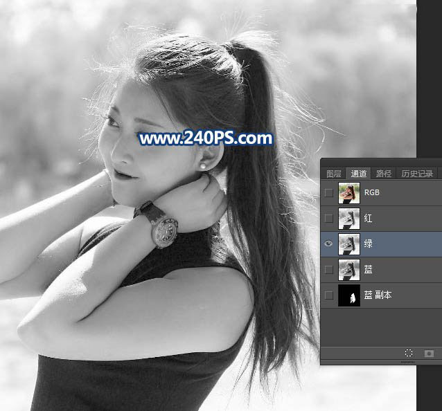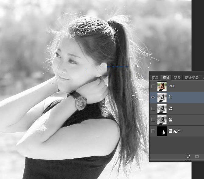2、分析图片。这种图片抠图难点是头发与背景层次不够分明,同时细发丝极多。可以进通道观察一下。