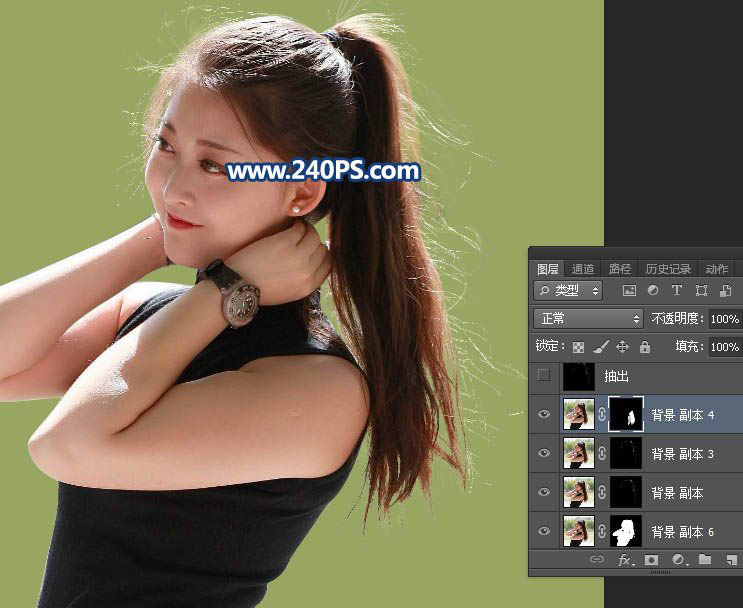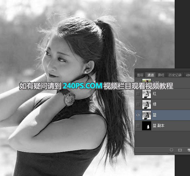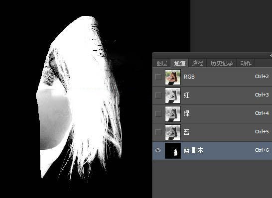 蓝通道局部头发与背景层次比较分明,不过大部分头发已经和背景融合。碰到这种情况,用一种方法是很难抠出发丝,需要综合多种方法。