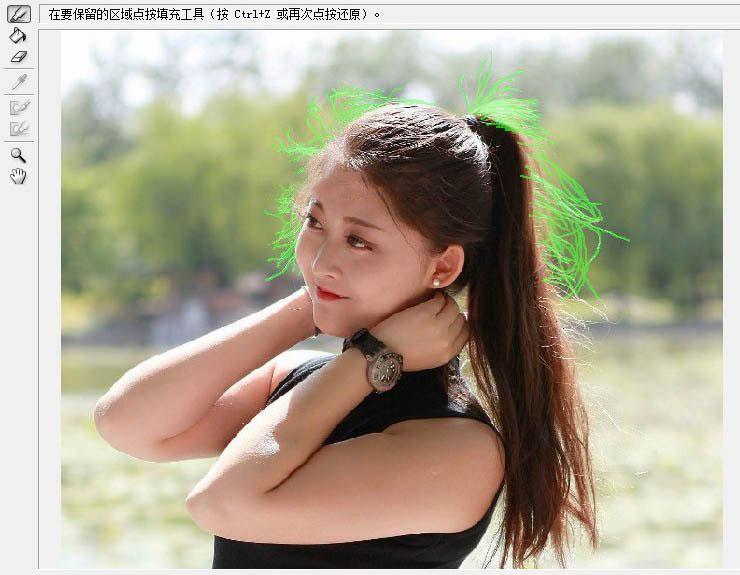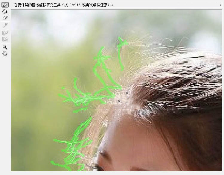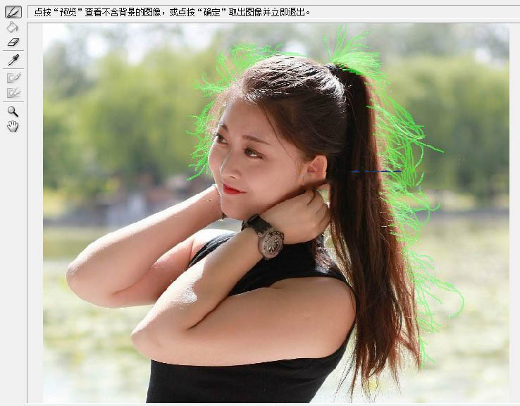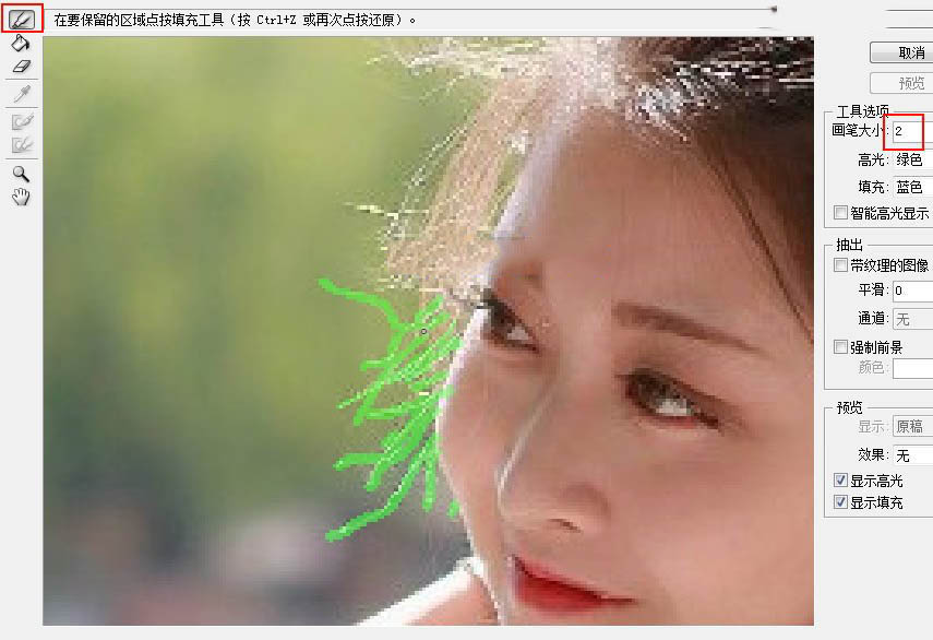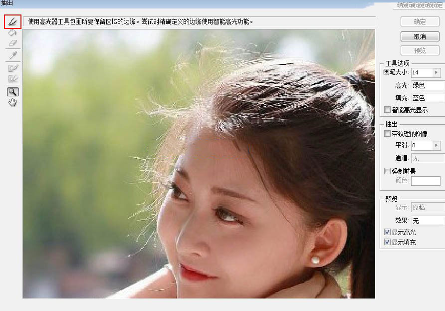 3、抽出滤镜抠细发丝。选择菜单:滤镜 > 抽出,高版本的需要自己去网上下一个。然后把图片放大一点,从左侧开始涂抹。