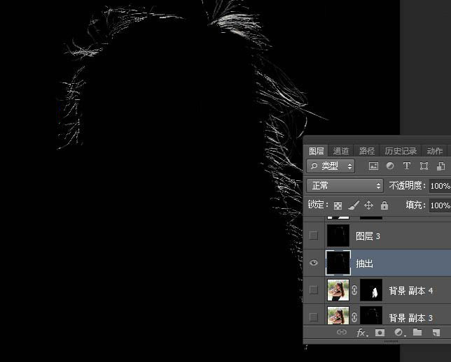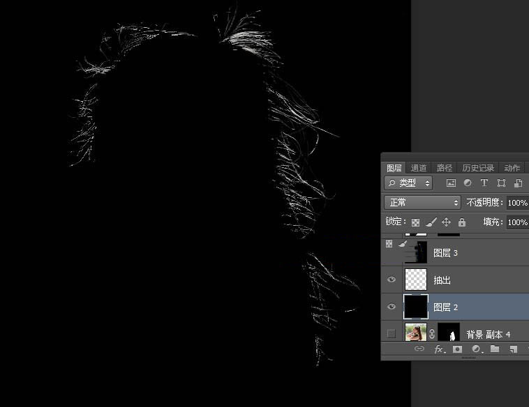 7、在当前图层下面新建一个图层,用油漆桶工具填充黑色,得到下图所示的效果,细发丝基本都抠出来了。