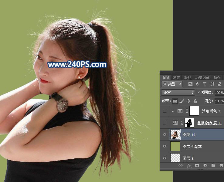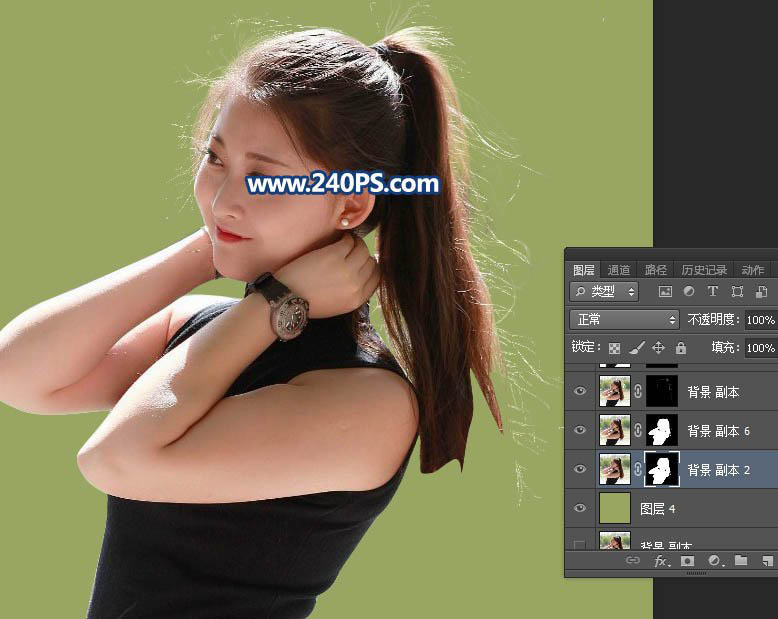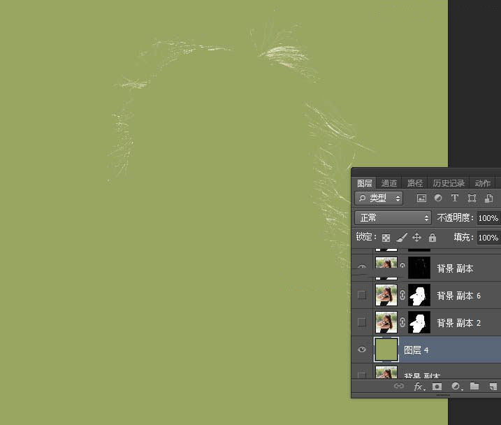 10、在当前图层下面新建一个图层,用油漆桶工具填充绿色#9AA762,如下图。