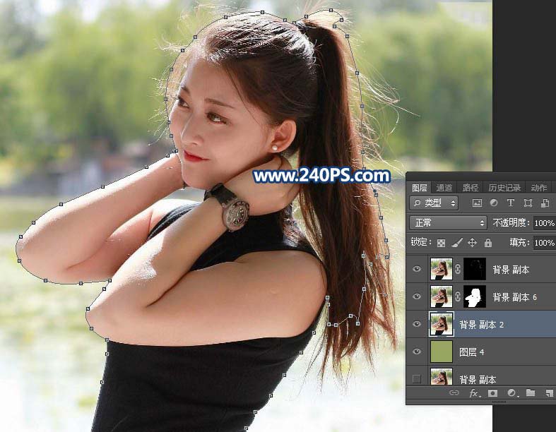 12、用钢笔勾出人物主体。把背景图层复制一层,按Ctrl + Shift + ] 置顶,用钢笔工具把人物主体部分勾出路径,如下图。