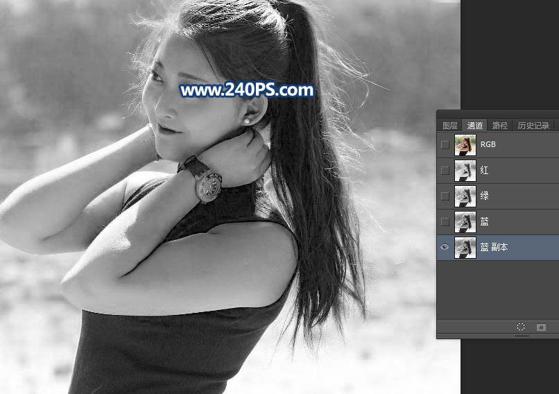 14、用通道抠出局部发丝。现在需要用通道抠出。把背景图层复制一层,按Ctrl + Shift + ] 置顶,进入通道面板,把蓝色通道复制一份,得到蓝副本通道,如下图。