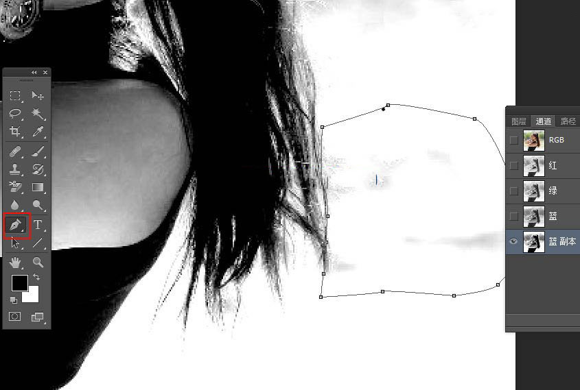 16、我们只需要右下角区域的发丝,用钢笔工具把发丝边缘区域勾出,转为选区后填充白色。