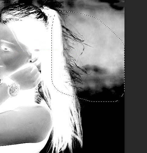 18、用套索工具把右下角的发丝选取出来,按Ctrl + Shift + I 反选,然后填充黑色。