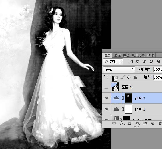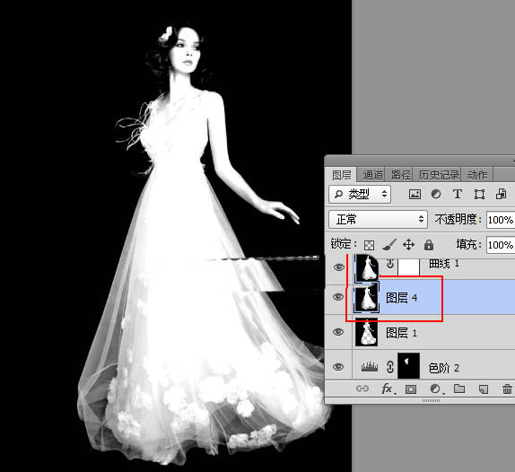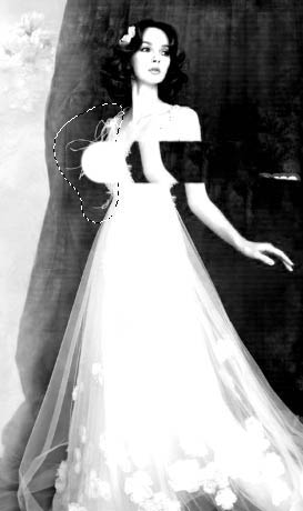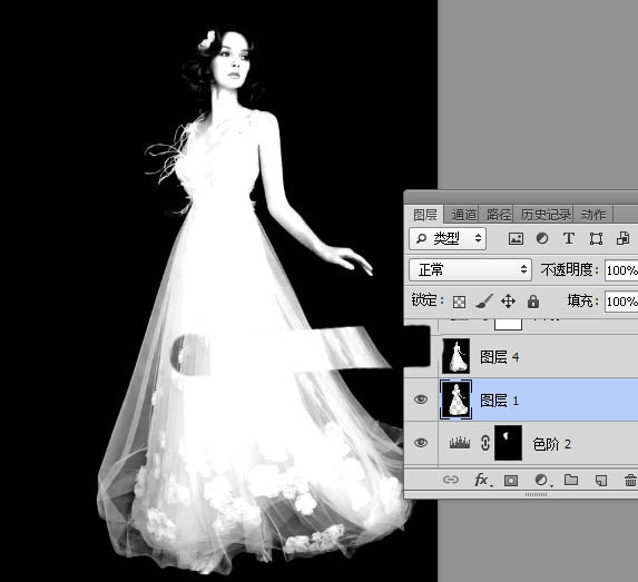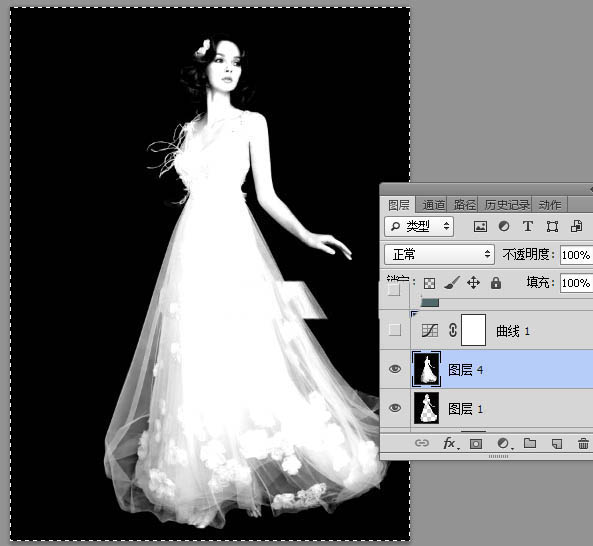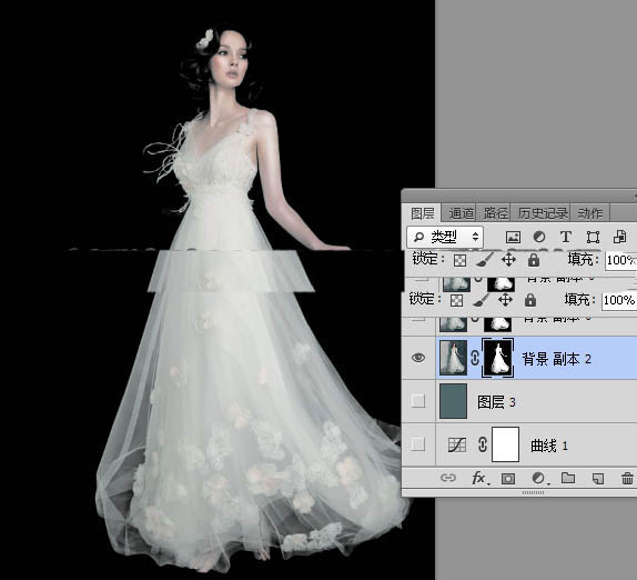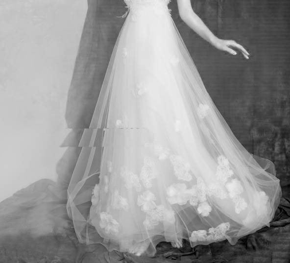 本文抠出分为两个部分。首先是婚纱裙子部分,这一部分相对要难一点,因为裙子边缘及底部区域都是半透明的,通道中处理的时候不能调得过亮;然后是头发部分,颜色比较暗,比较容易抠出。