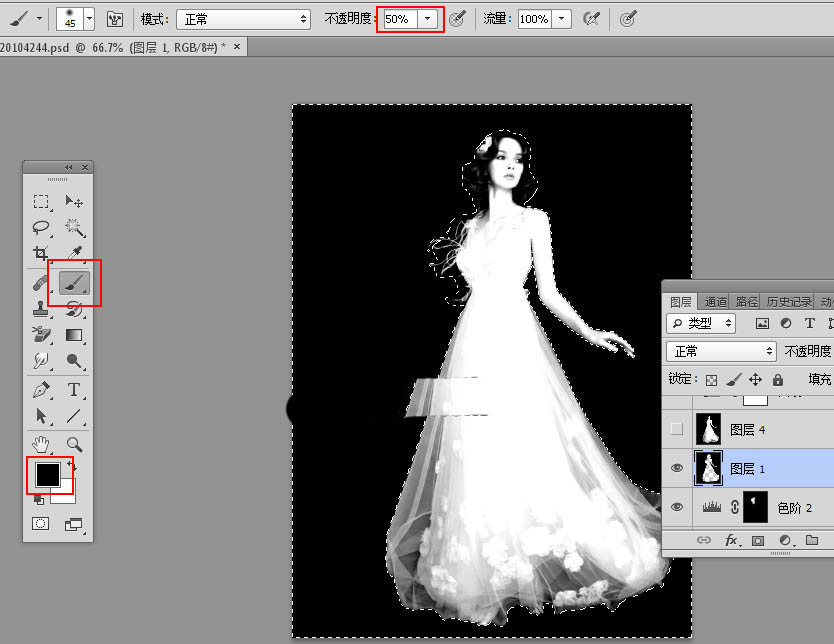 12、新建一个图层,把前景色设置为黑色,选择画笔工具,画笔不透明度设置为50%,然后把人物以外的区域涂黑,如下图。