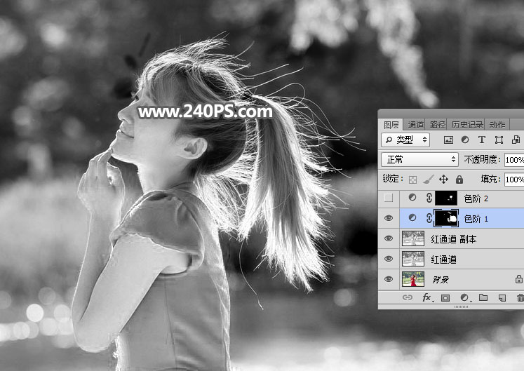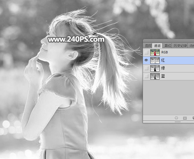 红通道:发丝非常亮,背景都是灰色,比较理想。