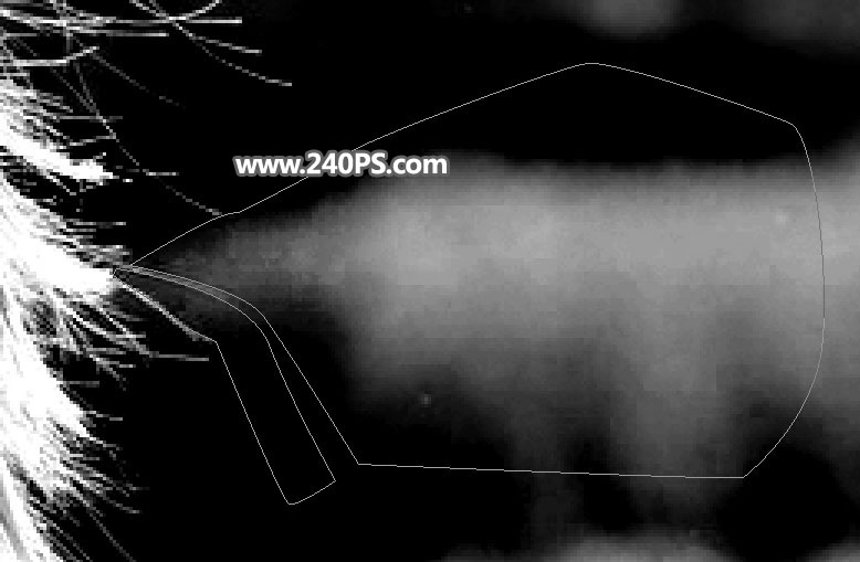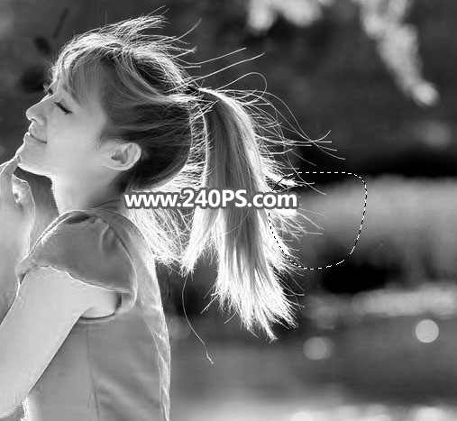 5、现在来压暗背景。在工具箱找到套索工具,然后勾出下图中较亮的背景和发丝区域,并把选区羽化8个像素。